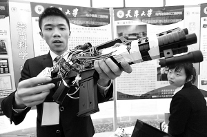 4月17日,一名大学生在展示设计作品“基于微传感器和射频技术的人际交互体感游戏终端”。 当日,天津大学举行第八届天地伟业“挑战杯”学生课外学术科技作品竞赛暨“创新、实践、成才”学生科技活动月启动仪式,展出50余件涉及精密仪器、机械控制、土船水建、能源化工、电子电工、管理与社会科学等方面的学生科技作品,其中本科生创作的作品数量占总量的近85%。 新华社发(李想 摄)