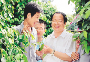 | 中国热带农业科学院院长王庆煌(右)和农民们在一起。