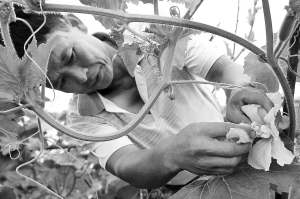 | 4月18日,在儋州市中和镇七里坡冬瓜基地,种植户周培根在给冬瓜人工授粉。