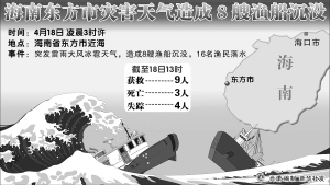 4月18日凌晨2时许,东方市板桥镇利章村约28艘渔船前往距离利章港8海里的预定海域进行捕捞作业。凌晨3时30分,凤丘沙海上突然刮起大风,雷电闪鸣,随后伴有大块冰雹降落,一股龙卷风突袭而至,该村有8艘12匹马力左右的渔船被海浪打翻,16人落水。共有3名渔民不幸遇难,9名渔民获救,4名渔民失踪。搜救工作目前仍在继续。