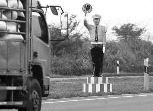 4月20日,在海口绕城高速,一座仿真警察手持警示牌全天候“上岗执勤”。