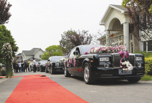 4月21日,由20多辆豪华婚车组成的迎亲车队驶往温州市鹿城区某别墅区迎娶新娘。当日,浙江温州市鹿城区的一对新人举行婚礼,迎亲婚车动用了26辆包括劳斯莱斯、法拉利、兰博基尼等在内的豪车,这些名车初步估价达一个多亿。新华社发