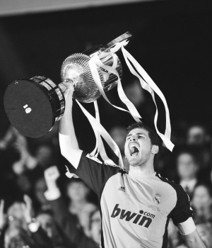 | 皇马队长卡西利亚斯高举国王杯在看台上庆祝。 新华社发 |