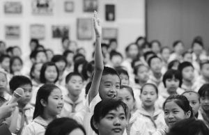4月21日上午,在海口市第二十五小学海甸校区,由共青团海南省委、海南省少工委主办的“红领巾心向党”———海南省少先队纪念中国共产党建党90周年主题教育活动上,一名少先队员举手,大声抢答的情景。当天,海口市辅导员和少先队员代表近1000人参加了该活动的启动仪式。 本报记者 马春华/文 张杰/摄