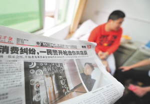 4月21日,伤者李某在医院里接受治疗。图片前景为当地报纸对这一事件的报道。 广西桂林市公安局当日通报,依照法律程序,桂林市公安局象山分局已对涉嫌枪击他人的民警陆涛实施刑事拘留,另一涉案民警黄某,已被来宾市公安局施行异地禁闭、隔离审查。2011年4月18日21时30分许,来宾市公安局兴宾分局城北派出所民警陆涛和同事黄某在酒店消费结账时,因收费问题与李某发生争执,情绪激动的陆涛拔出随身携带的手枪击中酒店员工秦某和李某。 新华社发
