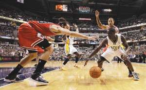 客场作战的公牛队在开场之后首先进入了状态,首节以21:17稍占上风,步行者队在第二节开始阶段凭借一波9:3的小高潮追平了比分,双方以42:42的平局进入中场休息。