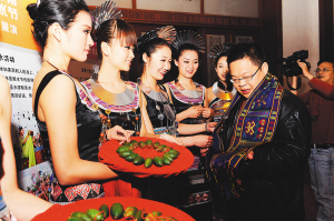 | 4月23日,上届七仙形象小姐在北京举行的新闻发布会上给嘉宾披上黎锦。