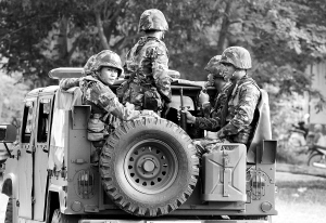 | 4月23日,泰国士兵乘坐军车离开一座难民营。 新华社/路透 |