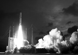 4月22日,法国巴黎时间23时37分(北京时间23日5时37分),欧洲阿丽亚娜5型火箭携带两颗通信卫星,从法属圭亚那库鲁航天发射中心发射升空。 新华社/法新