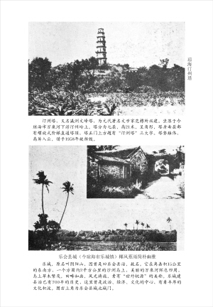 | 乐会县城(今琼海市乐城镇)椰风蕉雨,右上角为乐会县城北城门,《海南岛旅行记》插页。 |