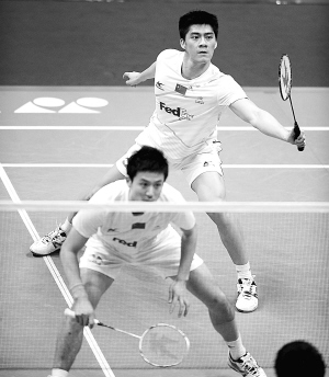 | 4月24日,蔡赟/傅海峰(上)在亚锦赛决赛中。 新华社发 |