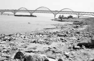 | 近日,受降雨偏少和上游来水少影响,长江九江段水位持续下降。截至26日14时,长江九江段水位降至9.86米,是该江段自1953年有水位纪录以来同期水位的最低值。 新华社发 |