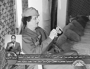 →这张利比亚国家电视台的电视截图显示的是4月25日,在北约空袭阿齐齐亚兵营数小时后,卡扎菲在首都的黎波里的一处帐篷中的情景。 北约战机4月25日凌晨轰炸利比亚领导人卡扎菲在首都的黎波里的住所所在地阿齐齐亚兵营。但利比亚政府发言人穆萨·易卜拉欣当日说,卡扎菲并没有在此次空袭中受伤,“在一处安全地方……很好,非常健康”。 新华社/路透