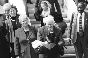 | 4月26日上午,美国前总统吉米·卡特(中)在平壤顺安机场接受小学生鲜花。