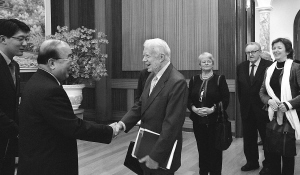| 朝中社四月二十六日提供的照片显示,朝鲜外务相朴义春(左二)在平壤百花园迎宾馆会见到访的以美国前总统卡特(右)为团长的“元老集团”代表团一行。