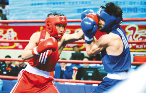 | 26日,在大连进行的全国男子拳击锦标赛49公斤级决赛中,贵州队选手邹市明以9:3击败江苏队选手蒋金永,夺得冠军。图为邹市明(左)在比赛中击中对手。
