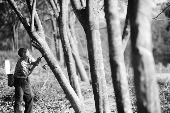 近日,琼海橡胶陆续开割。承接去年的涨势,今年我省橡胶价格继续走高,目前干胶收购价已达每公斤35元左右,再创历史新高。图为4月26日,琼海万泉镇的群众在割胶。 特约记者 蒙钟德 摄
