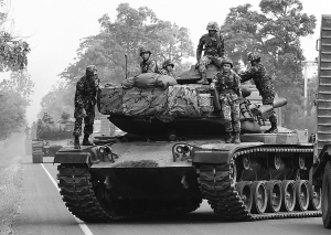 4月28日,泰国军队的一辆坦克行驶在与柬埔寨交界的素林府。 柬埔寨与泰国边境前线指挥官28日举行谈判,双方一致同意无条件停止已持续了7天的边境武装冲突。 新华社/路透