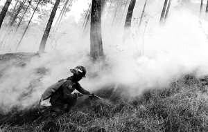 烟雾致一些国际航班延误 4月27日,在洪都拉斯首都特古西加尔巴以北的埃尔阿蒂约地区,一名消防人员在用灭火器灭火。近日发生的山林大火已烧毁5万公顷的山林;同时,由于山林大火造成烟雾弥漫,导致一些国际航班延误。 新华社/法新