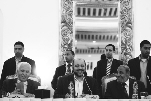 4月27日,巴勒斯坦民族解放运动(法塔赫)谈判代表团团长阿扎姆·艾哈迈德(前左)和伊斯兰抵抗运动(哈马斯)谈判代表马哈茂德·扎哈尔(前中)在埃及首都开罗出席联合新闻发布会。 据法塔赫和哈马斯的消息,双方已于27日在埃及首都开罗就组建过渡政府达成一致,并已就长期以来阻碍实现内部和解的相关问题达成谅解。 新华社记者纳赛尔摄