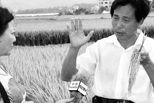 | 超级稻“40-8”验收现场,媒体采访水稻专家刘志彬。本报记者 程范淦 摄 |