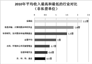 在城镇非私营单位中,2010年平均工资最高的三个行业分别是金融业80772元,是全国平均水平的2.2倍;信息传输、计算机服务和软件业66598元,是全国平均水平的1.8倍;科学研究、技术服务和地质勘查业57316元,是全国平均水平的1.5倍。
