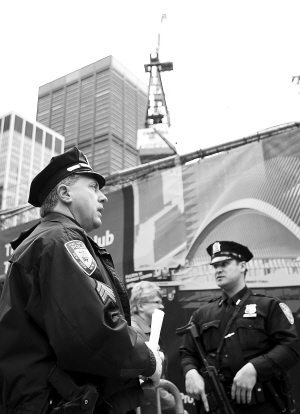 | 5月2日,两名警察在美国纽约世贸遗址附近执勤。美国总统奥巴马1日晚宣布“基地”组织领导人本·拉丹被击毙后,纽约市2日在时报广场、世贸遗址附近及大中央车站等重要公共场所加强警力,以防止出现新的恐怖袭击。 新华社记者 伍婧丹 摄 |