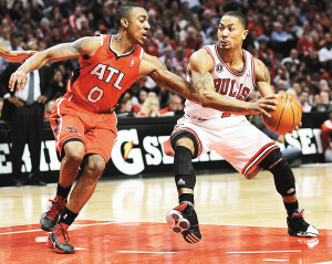 | 5月2日,NBA季后赛第二轮首场比赛中,芝加哥公牛队主场以95:103不敌亚特兰大老鹰队。图为公牛队球员罗斯(右)在比赛中带球突破。 新华社发 |