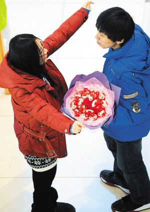 | ↑情人节时,一位男士在北京一商场内为女朋友送上鲜花。