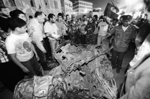 5月3日,人们聚集在利比亚班加西发生汽车爆炸的现场附近。 当晚,利比亚东部城市班加西市中心解放广场附近发生一起汽车爆炸,汽车发生爆炸时,旁边的解放广场正有上千人进行反对卡扎菲的抗议活动。截止目前没有人员伤亡报告。 新华社/法新