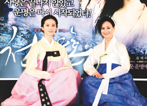 5月4日,演员刘亦菲(左)和惠英红身穿韩服出席新版电影《倩女幽魂》的媒体试映会。