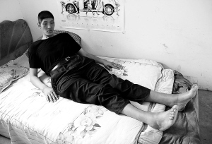 5月5日,湖北襄阳巨人刘文哲躺在自家的床上。普通的床太短,他只好又续出一段床板。