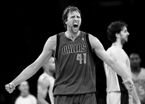 | 北京时间5月5日,小牛队在NBA西部半决赛第二回合比赛中客场以93:81战胜湖人队。总比分以2:0领先。在同日进行的一场东部半决赛中,公牛队以86:73战胜老鹰队,将总比分扳为1:1。图为小牛队主将诺维斯基庆祝胜利。
