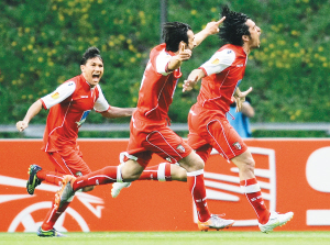 北京时间5月6日,在欧罗巴联赛半决赛次回合比赛中,葡萄牙布拉加队主场以1比0战胜本菲卡队,晋级决赛。图为布拉加队球员庆祝进球。 新华社发