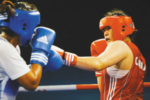 在女子81公斤以上级的比赛中,中国选手李云飞(右)以11:3战胜印度选手,进入决赛。 本报记者 宋国强