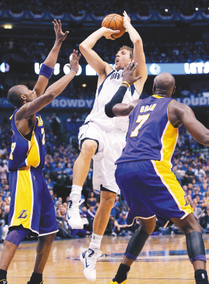 | 北京时间5月7日,小牛队主将诺维茨基(中)在与湖人的比赛中投篮。 新华社发 |