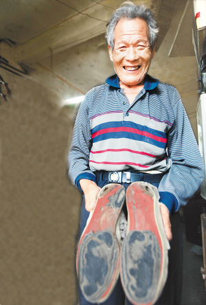 | 程方喜老人展示当年步行北京穿过的鞋。 |