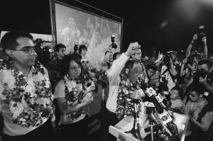 5月8日,在新加坡,反对党工人党秘书长刘程强(左三)获得集选区胜利后在台上答谢支持者。新加坡新一届国会选举结果8日凌晨揭晓,执政党人民行动党获得87个议席中的81席,继续保持压倒性优势。反对党工人党获得6席,其中包括反对党首次赢得的一个集选区。这是反对党自1988年集选区制度引入以来首次赢得一个集选区。 新华社发(邓智炜摄)