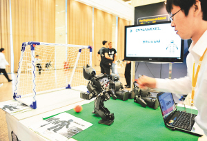 5月9日,IEEE世界机器人与自动化大会上展示的一个机器人正在踢球。 当日,2011年IEEE世界机器人与自动化大会在上海国际会议中心召开,本届大会的主题是“机器人,让生活更美好”。据悉,参会人数超过1700人。 新华社记者 张建松 摄