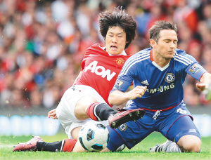 9日,在主场2:1击败切尔西队之后,曼联距离球队历史上第十二个英超冠军只差1分。图为曼联队球员朴智星(左)与切尔西队球员兰帕德拼抢。 新华社发
