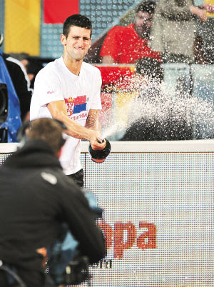 马德里网球公开赛 小德夺冠 5月8日,在马德里网球公开赛男单决赛中,德约科维奇以2:0战胜西班牙选手纳达尔,夺得冠军。图为塞尔维亚选手德约科维奇在颁奖仪式上开香槟庆祝。 新华社发
