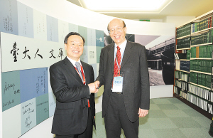 5月9日,北京大学校长周其凤(左)与台湾大学校长李嗣涔出席签署协议活动。 当日,北京大学校长周其凤、台湾大学校长李嗣涔及两校有关负责人在台北分别签署了《北京大学与台湾大学交换学生计划协议书》等协议,进一步扩大两校在科学研究、人才培养等方面的合作。 新华社发(吴景腾 摄)