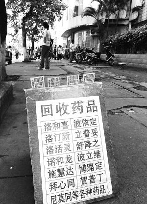 在海南省人民医院龙华门诊大楼附近,一对操外地口音的中年男女蹲坐在一家杂货店前,脚边摆了一张对开大小的纸板,上面列着近20种所收药品的名称,包括吗丁啉、斯达舒、芬必得等常用药,以及用于心脑血管疾病、糖尿病等慢性疾病的药。记者随意问了几种药的收购价,答复约为药店出售价格的3-7折。记者询问他们对所收药品有什么要求时,中年女子表示,要包装完整,至于药品的保质期等问题,则要看实物再定。中年女子说,他们收的多是些比较便宜的药,药价一般在10多元至几十元。