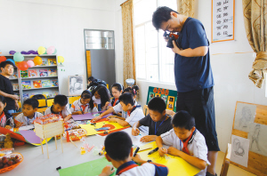 | 5月11日,来自广东的摄影师正在拍摄上绘画课的孩子们。