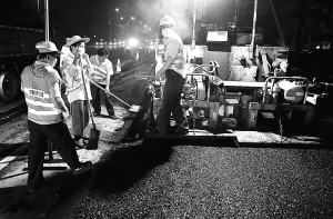 5月10日凌晨,在海口市丘海大道,市政维修工人在专家指导下,利用新型材料岩沥青改性沥青AC-13C型沥青混凝土维修路面。该材料可缓解传统沥青路面遇高温、雨水时出现车辙、拥包、裂缝等病害的状况,试验后如确实可行,将在海口市各主要路段推广使用。 本报记者 张杰 摄