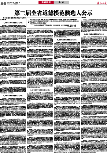 经各市县、省直各部门推荐,第三届全省道德模范评选委员会评选,产生第三届全省道德模范候选人48名(其中推荐第三届全国道德模范候选人10名),现将候选人名单和主要事迹向社会公示,接受群众监督。公示时间为5月12日至5月18日。