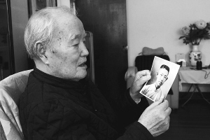 | 5月8日,在上海康平路的家中,89岁的王杰老人手持父亲王尽美的照片默默相对。 新华社记者刘颖摄 |
