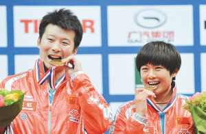 5月13日,在2011年世界乒乓球(单项)锦标赛混合双打决赛中,中国选手张超/曹臻以4比1战胜队友郝帅/木子,获得冠军。图为中国选手张超/曹臻(右)在领奖台上咬金牌留影。 新华社发