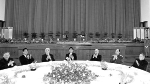 | 1999年2月10日,胡锦涛出席在人民大会堂举行的在京老同志迎春茶话会。右一为李德生。 |