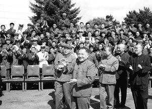 | 1978年9月16日,李德生(前右五)和彭冲等陪同邓小平在吉林省长春市接见当地干部。